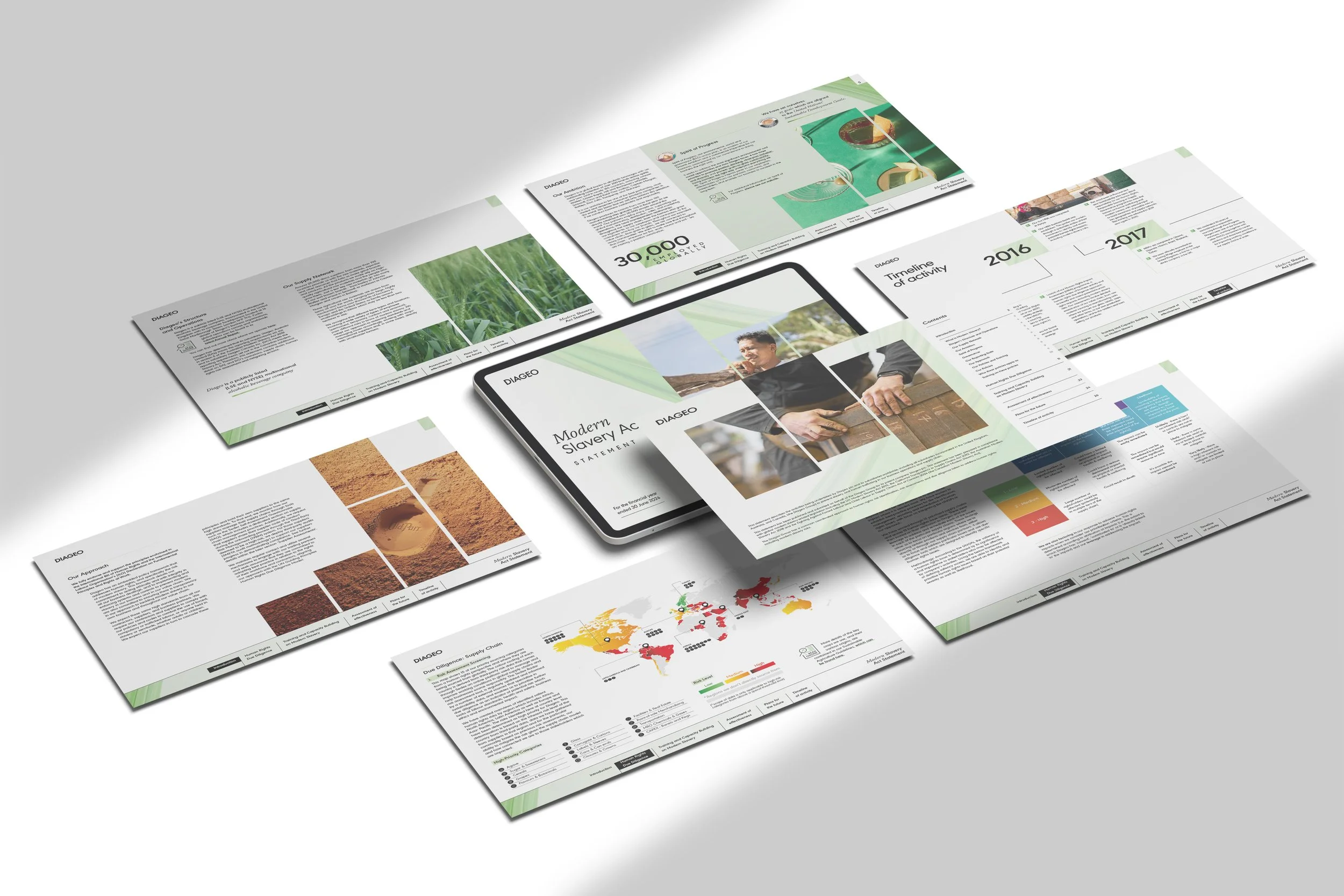 Altadicta’s approach centred on clarity, humanity, and design storytelling. We began by analysing Diageo’s existing materials and stakeholder expectations to understand how best to convey the depth of its work in preventing modern slavery and supporting ethical sourcing practices.